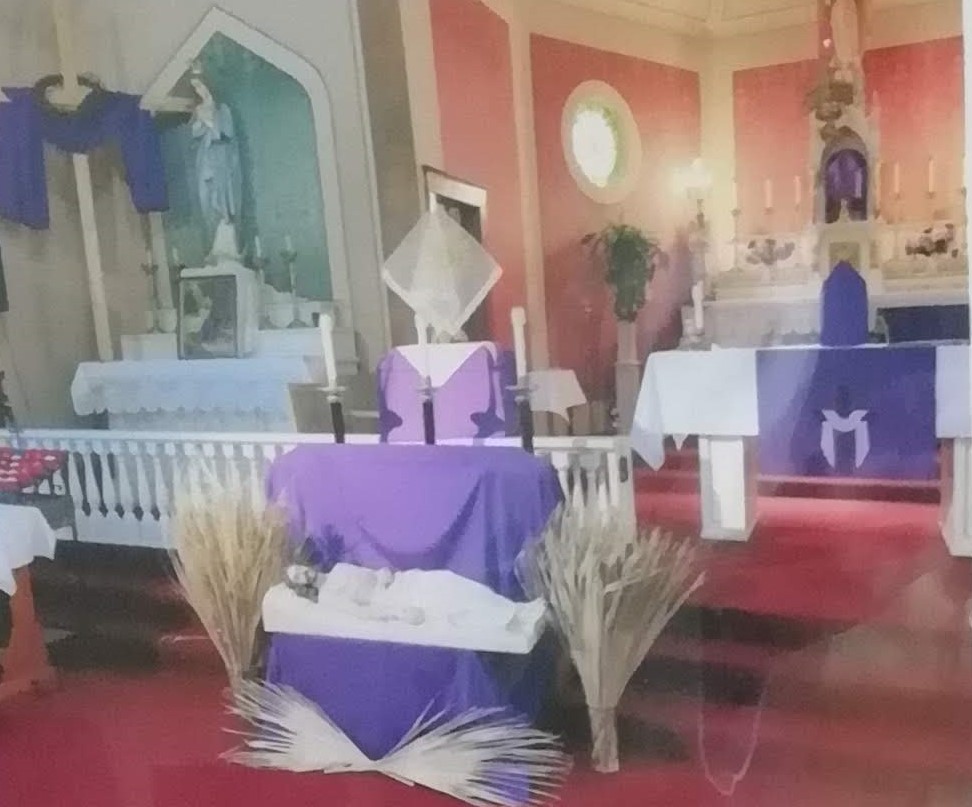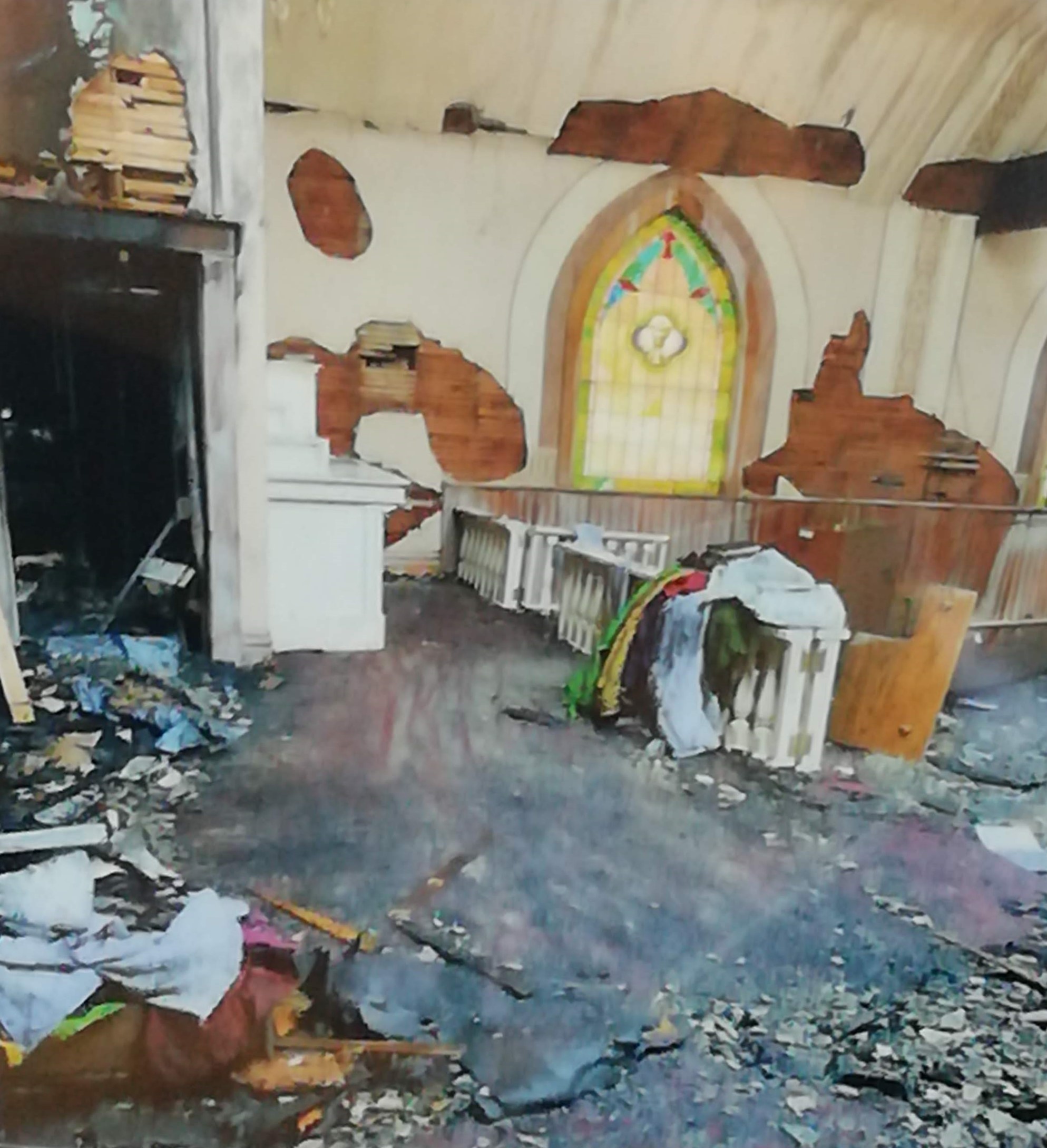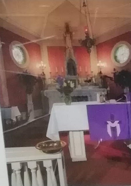 Kevin shared with me the church building is a total loss and must be razed. Although the exact cause of the fire is undetermined, arson is suspected. Fortunately, a few items were salvaged. These include the altar, a crucifix (although damaged), most of the stained-glass windows, chalices, and Stations of the Cross. The rectory and Pulaski Hall, which were not connected to the church building, are intact. The congregation continues to have Mass in Pulaski Hall. Photos are shown below of the devastation.